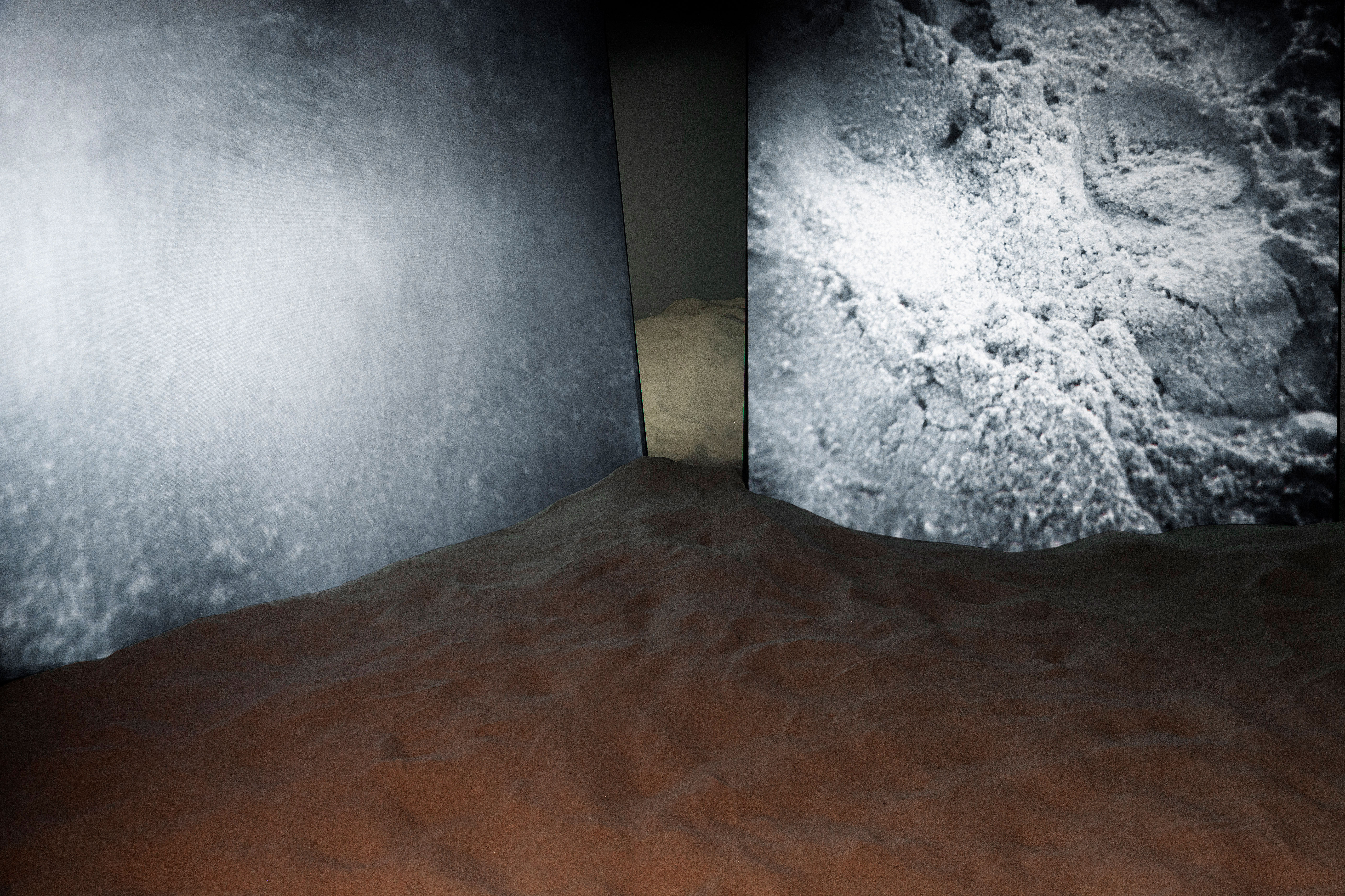 Two-channel video installation. Projection on black projection screens: 200 x 200 cm. 3 tons of sand. Duration: 17 mins.
