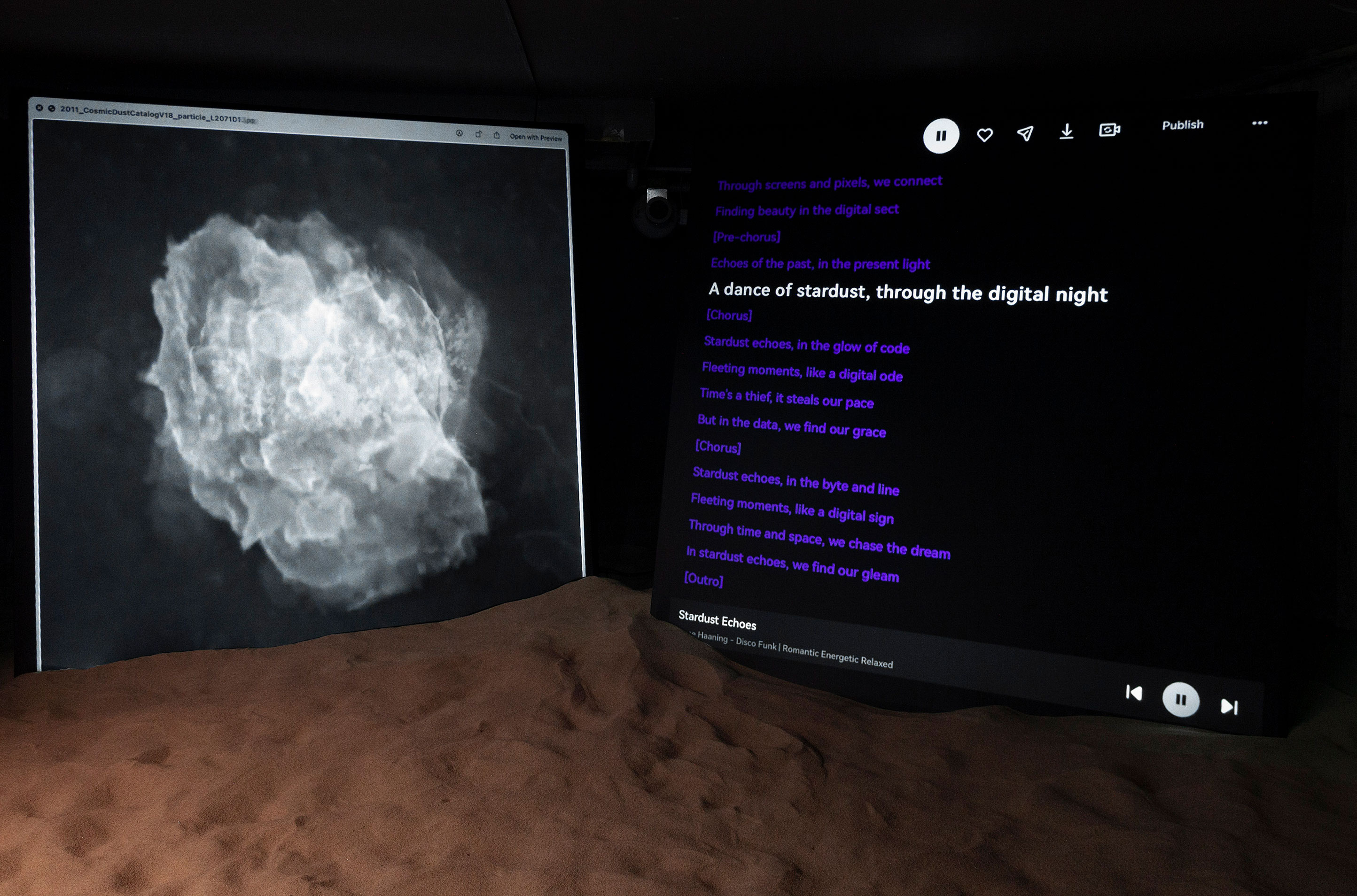 SPECKS is a two-channel video installation placed in three tonnes of sand connecting silicon's cosmic origins to its technological present. It was part of the exhibition Tracer Object.
