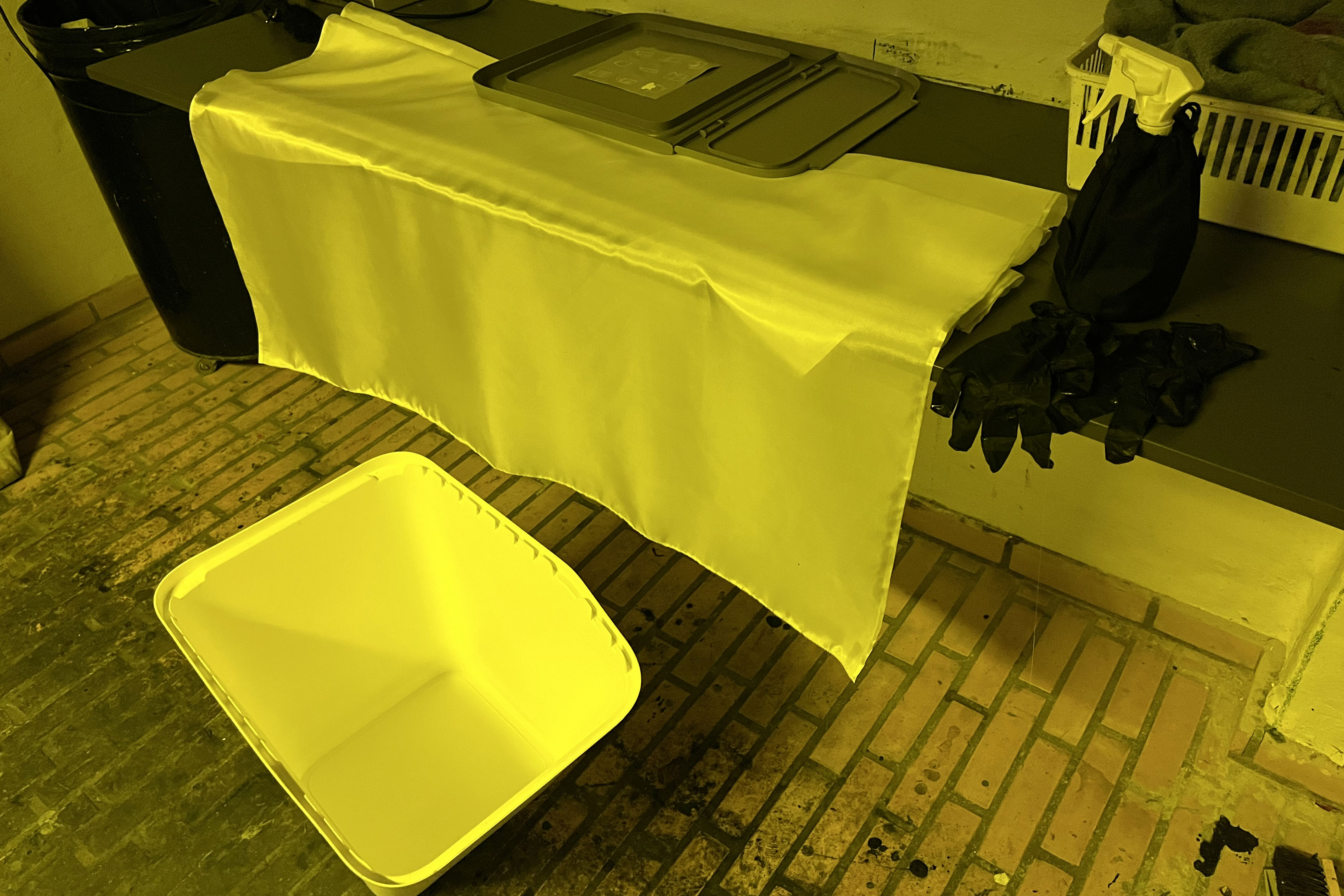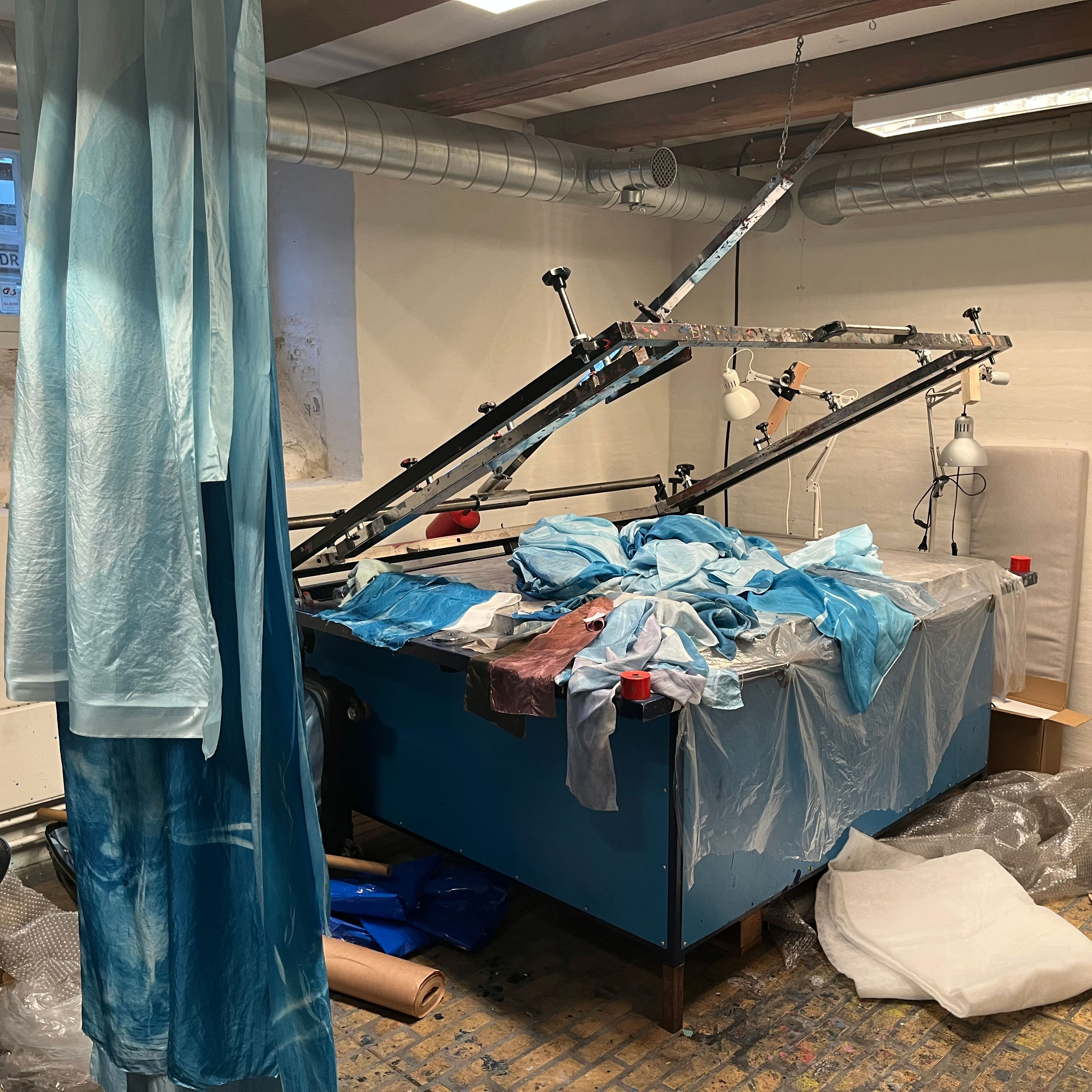 That meant that the kinds of traces the process would add became a matter of significance. Traces from uneven staining of the emulsion, for example, are hard to see as anything other than error. The traces that I settled on in this analogue printing process came from the folds in the silk during the exposure. For this to happen, the silks were intentionally made 80 centimetres too long for the frame. Given this extra material, it became both possible and necessary to fold, pad, and sometimes gently inflate the projection surface – the silk – which introduced a kind of depth and spatial animation into the image. This was amplified once the silk was hung in the exhibition space by the liveness of the material.