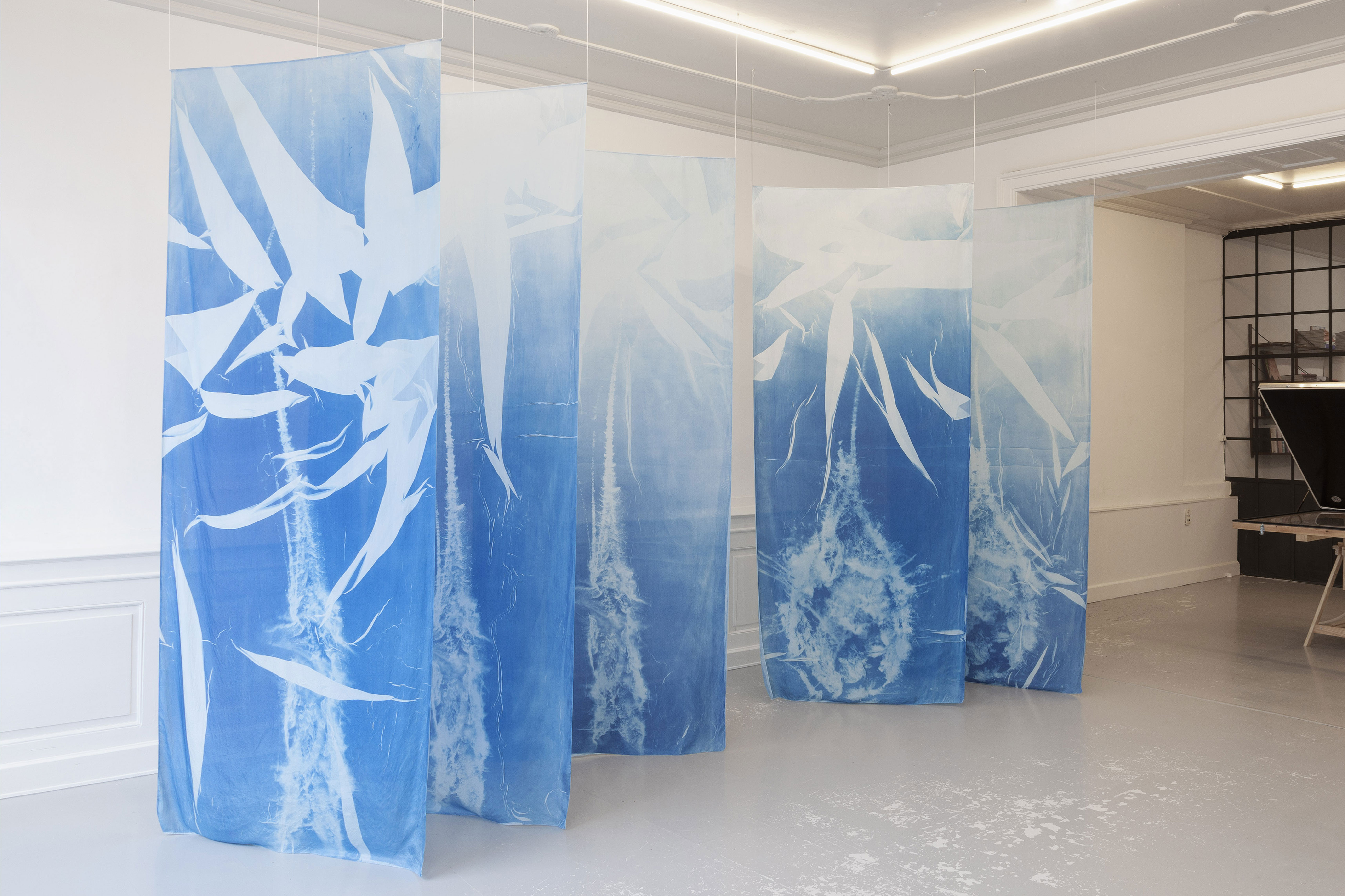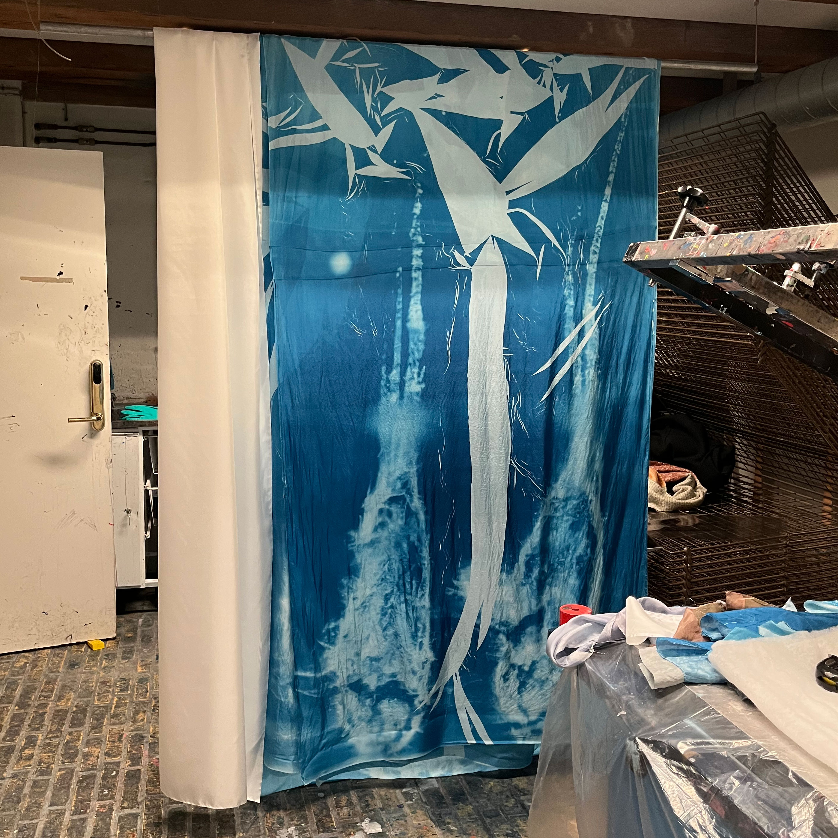 3 series of 5: T5, T32/69, T35, T80, T191. Cyanotype on white Habotai Silk in medium weight. Dimensions: 280 x 114 cm