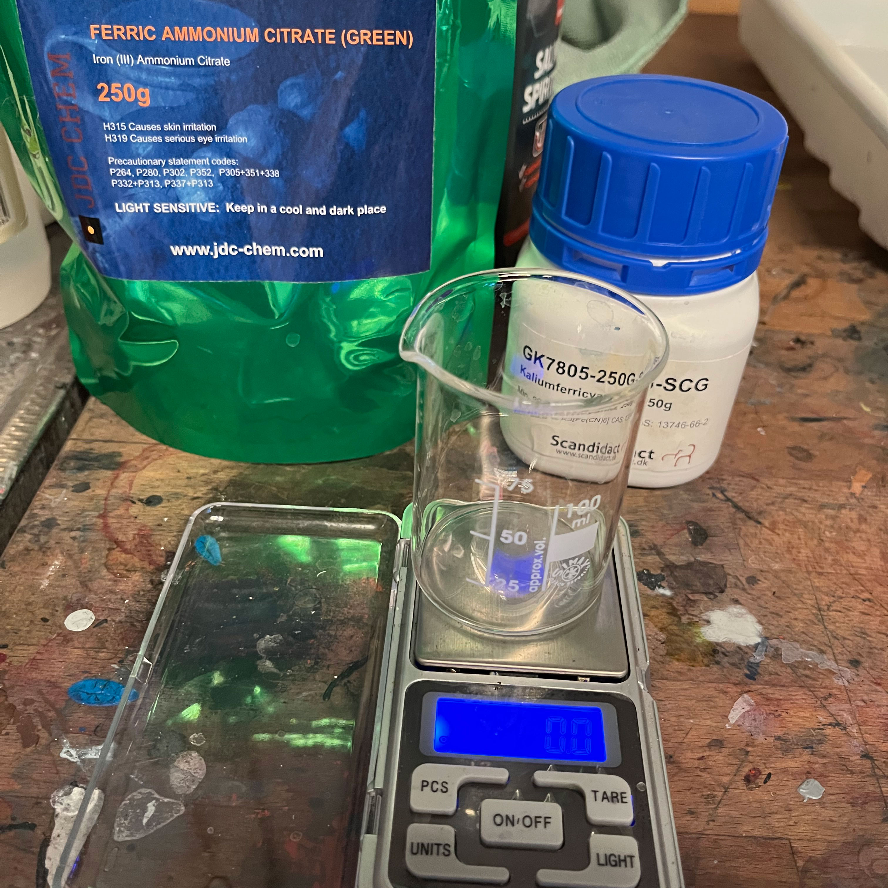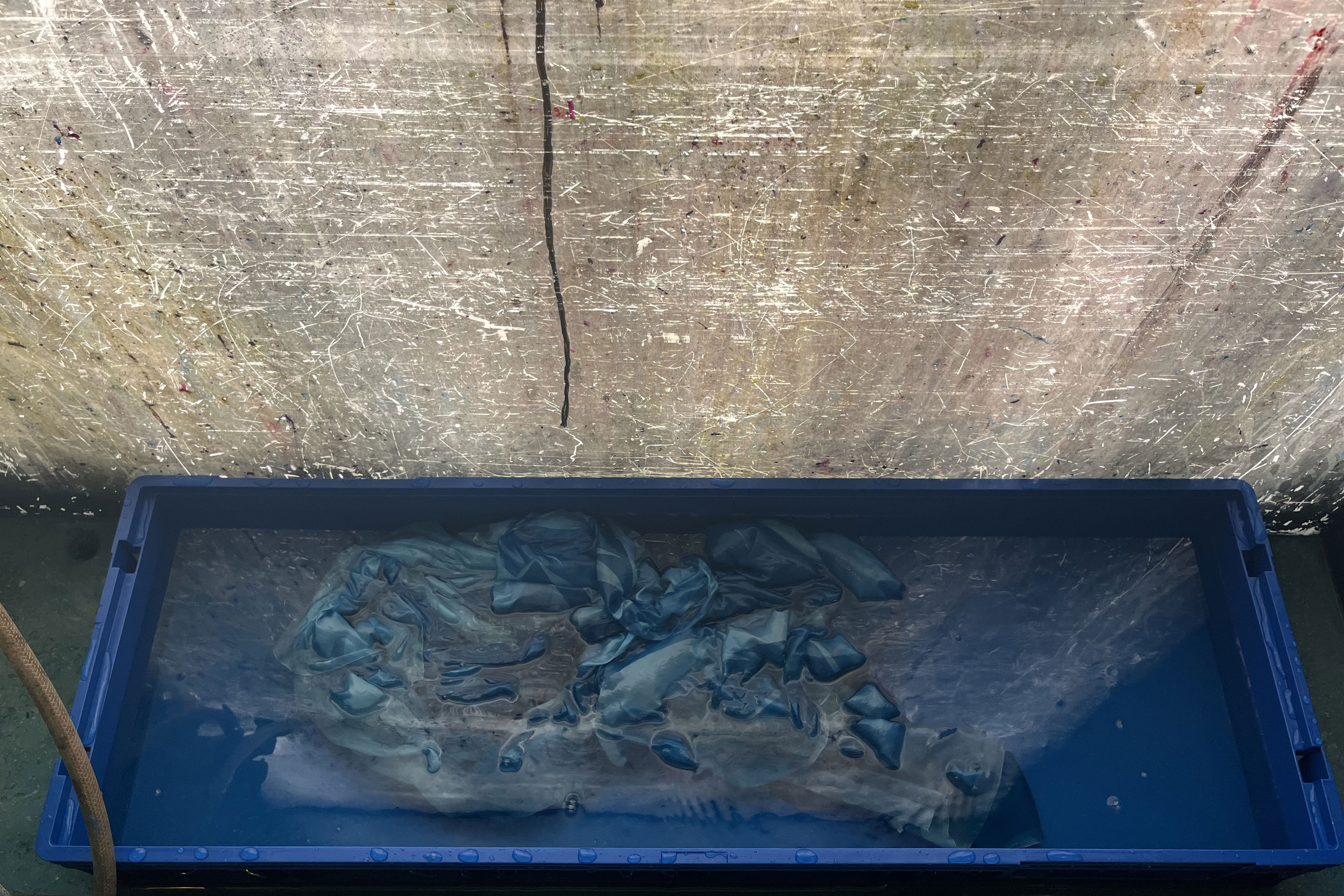 The cyanotype prints that are part of the exhibition Tracer Object were made by coating large sheets of white Habotai silk with a light-sensitive solution – equal parts ferric ammonium citrate and potassium ferricyanide. Sandwiched with transparencies of the tracesT5, T35, T32/69, T80 and T191, it was then exposed to UV light using a bespoke vacuum frame.