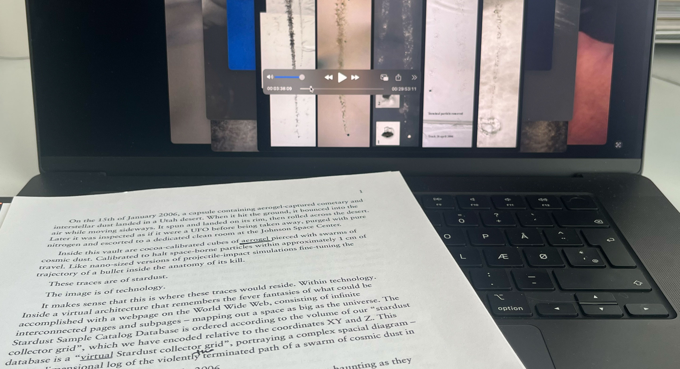 The image is turned into a kind of embedded log of the technological history of the image, where, even if the only extra traces you see are those made by the vacuum frame, I think the entire history of NASA’s mission is somehow opened for a creative anatomisation. Where there was once microscopy of a grain of cosmic dust, there is now also the space craft, the collector grid, the aerogel, Dr Keiko Messenger in the lab, the microscope, static eliminators together with my vacuum frame.